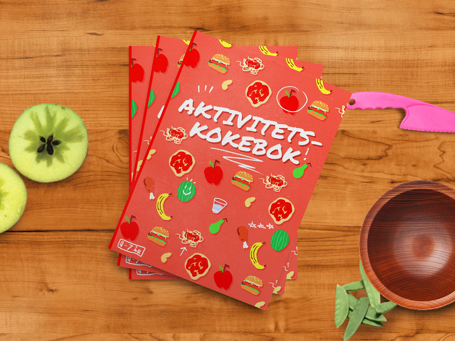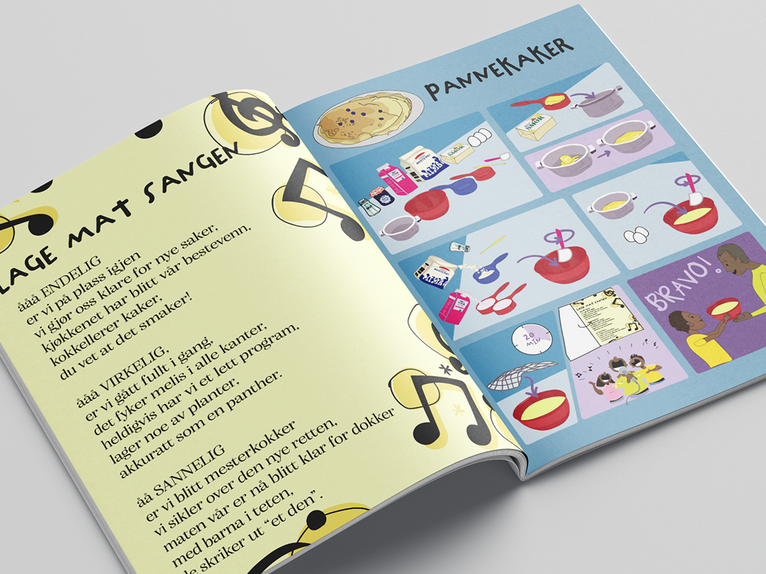 Activity booklet with illustrated recipes for pre-literate children, including songs, stickers and recipes using the included measurement cups based on colours.
