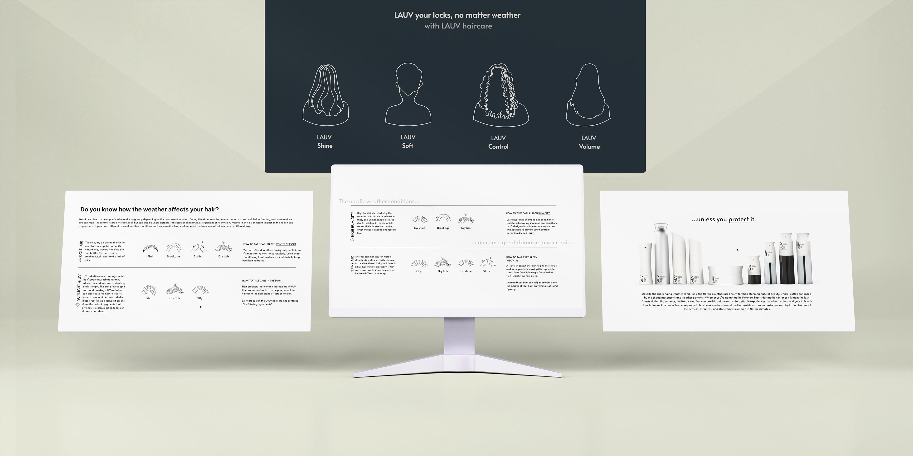 H2 Hairdressers wished to develop a new nordic hair product series based on nature from a Norwegian island called Lauvøya, where the client was raised. The project included shaping a complete brand identity, bottle design, packaging and website. In the north, we live in harsh climates with cold and dry air that wears down the hair. This series is tailored to customers who appreciate sustainable quality products for nordic conditions.