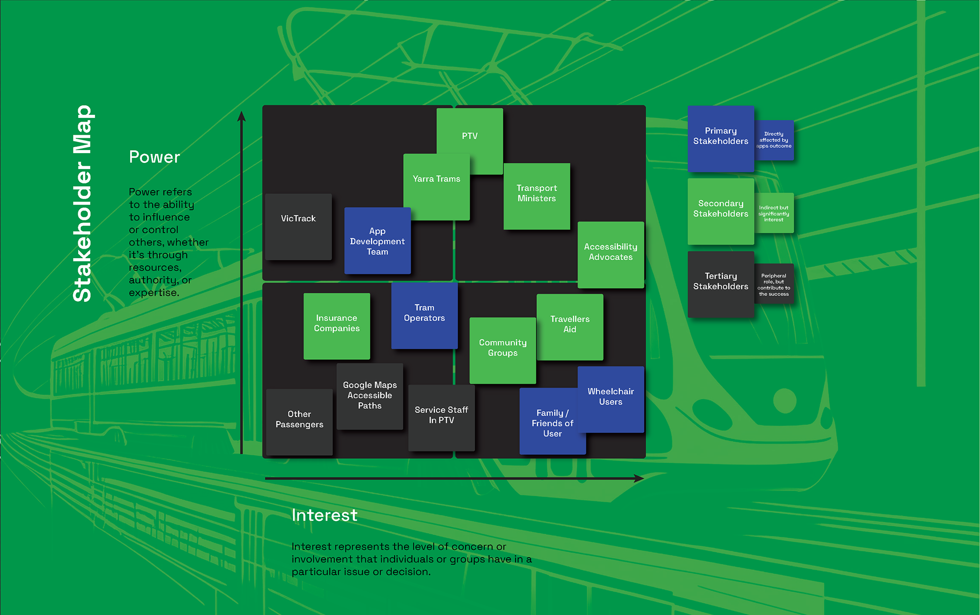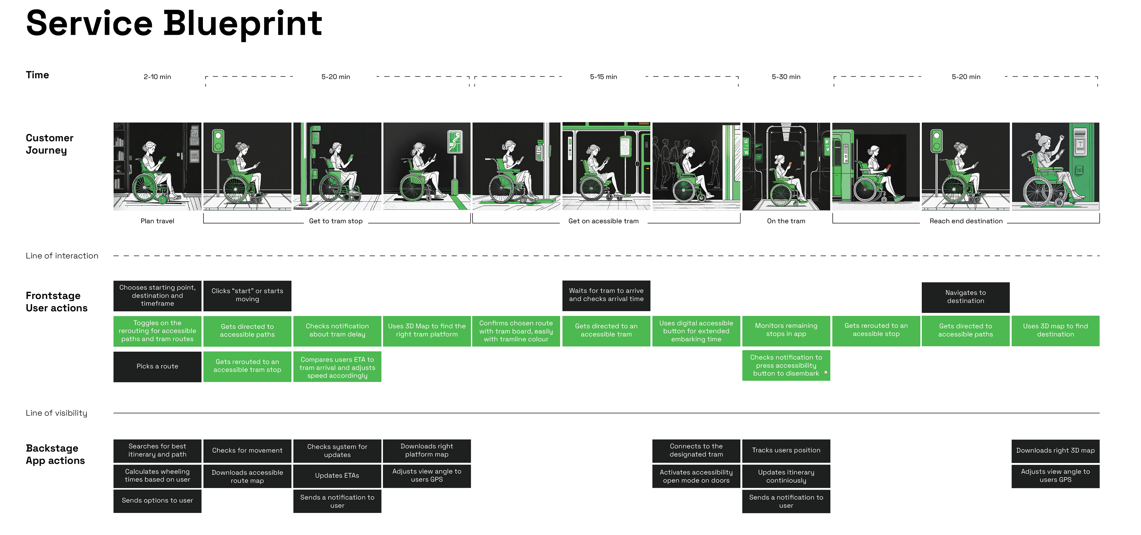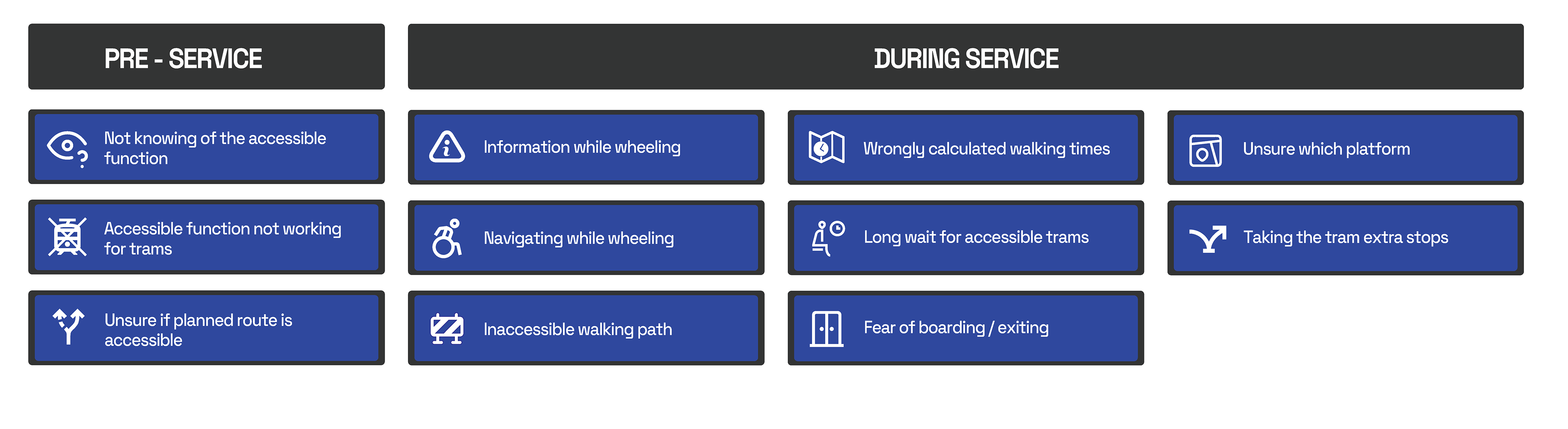 The journey mapping revealed how accessibility challenges occur across multiple stages of the service, such as travel app shortcomings, fear of disembarking and longer travel times due to inaccessible trams and stops. These design opportunities lead the project to achieve the greatest accessiblity impact.